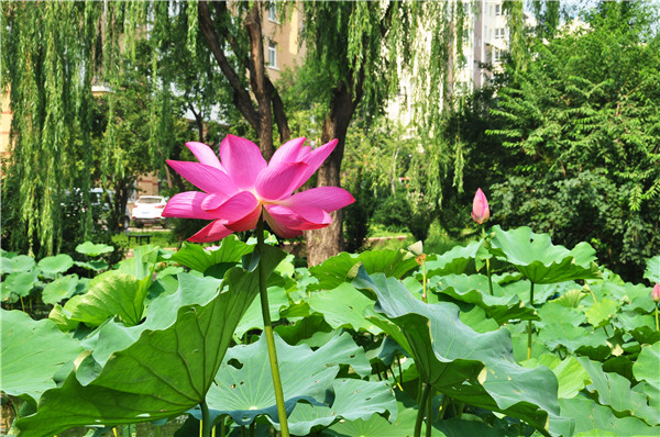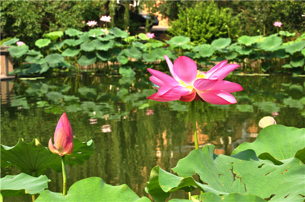 凌波仙子靜中芳,也帶酣紅學醉妝。一不留神,鏡湖清澈的一彎碧波在悠閑的錦鯉嘻戲之間,荷花之盛放,清靜而悠遠。讓夏日的鏡湖平添了幾分圣潔,一簇又一簇的荷花競相綻放,如那莘莘學子在一中美麗的校園中文質彬彬,茁壯成長!銘石煙柳,與眾不同。雖沒有牡丹的雍榮華貴,沒有梅花的鐵骨錚錚,沒有水仙的玲瓏清秀,也沒有桂花的十里飄香。但她從不與百花爭春,只選擇最難耐的夏日,盡情地綻放,風越大,她越勇敢的挺直胸膛,為一中的師生送來絲絲清涼,陣陣幽香,為一中的校園添了幾多美景,增添了幾分神韻。她不懼高熱,外形清秀潔凈,出污泥而不染,濯清漣而不妖,正如一中教師那高貴的形象、堅貞的品質。荷葉的輕語,溶解在鏡湖池水里。在盛熱的夏天,唯有她青澀地揚起笑臉,襯著露珠的清澈耀眼,給予一中學子們最淡雅的夏天。陽光燦爛,空氣清新,讓我們在鏡湖的荷塘邊,欣賞荷花的美麗和清香。