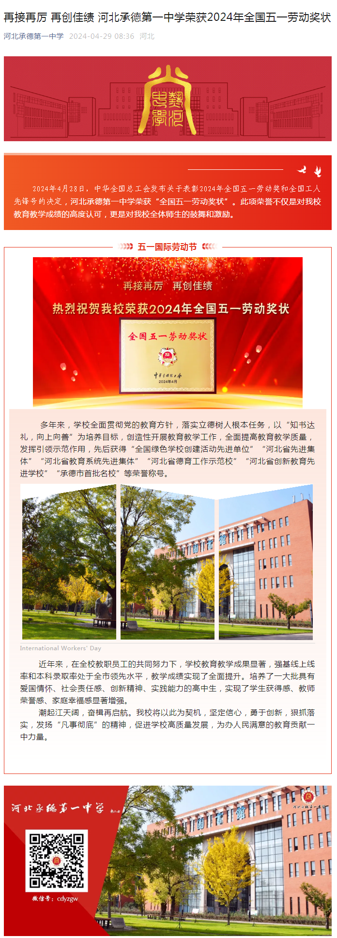 再接再厲 再創(chuàng)佳績(jī) 河北承德第一中學(xué)榮獲2024年全國(guó)五一勞動(dòng)獎(jiǎng)狀