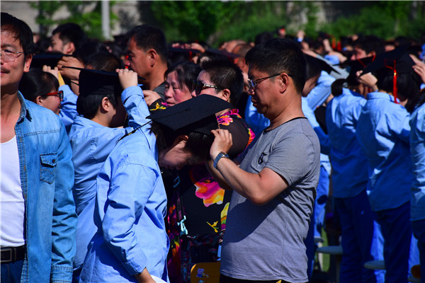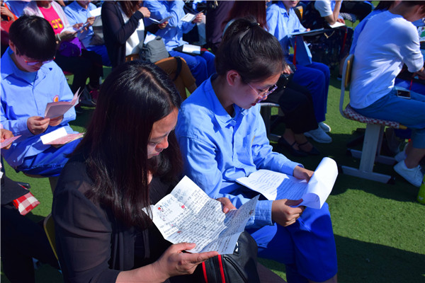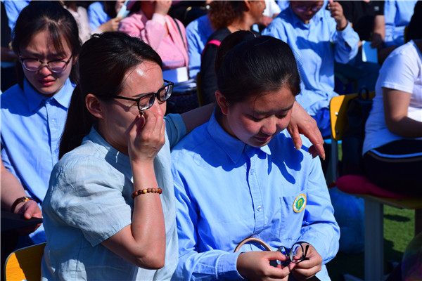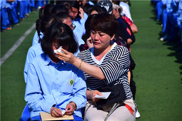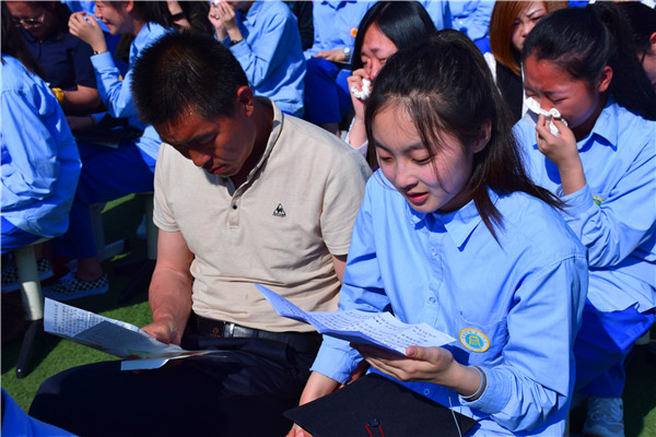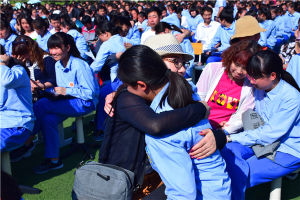書信的互換,學生與父母的牽手和擁抱,讓家長和孩子的感情在這里釋放,淚水打濕了無數家長和孩子們的臉頰,家長們親手為自己的孩子戴上成人帽,拉著孩子的手走過“成人門”,完成了從“孩子”到“成人”的角色轉變。